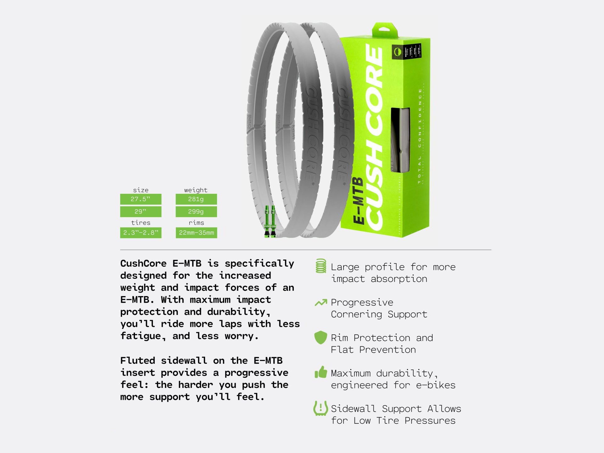 - Includes: (1) CushCore tire insert, (1) 44mm CushCore presta air valve, valve core tool, installation instructions, and rim stickers