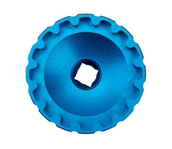 A precision CNC-machined aluminum tool for the installation and removal of select threaded bottom brackets with 16-notch tool fittings, including Enduro® T47 & PF30 bottom brackets. Manufactured in-house by Park Tool, anodized for easy identification and featuring a ratchet/torque wrench-compatible 3/8" drive.