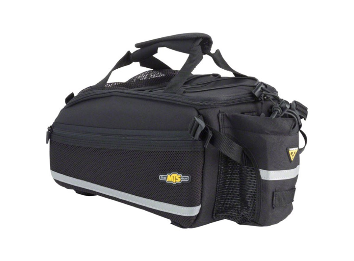 The Topeak Trunk Bag EX with strap mount is designed for cyclists seeking a versatile and durable storage solution that easily attaches to any rear rack. Constructed with rigid molded panels and flexible 600 denier fabric, this bag offers superior rigidity and water repellency to keep your gear protected in all conditions. The insulated main compartment and additional mesh side pockets provide ample space for your essentials, while the strap mount system allows for compatibility with racks that do not support the MTX QuickTrack™ system.